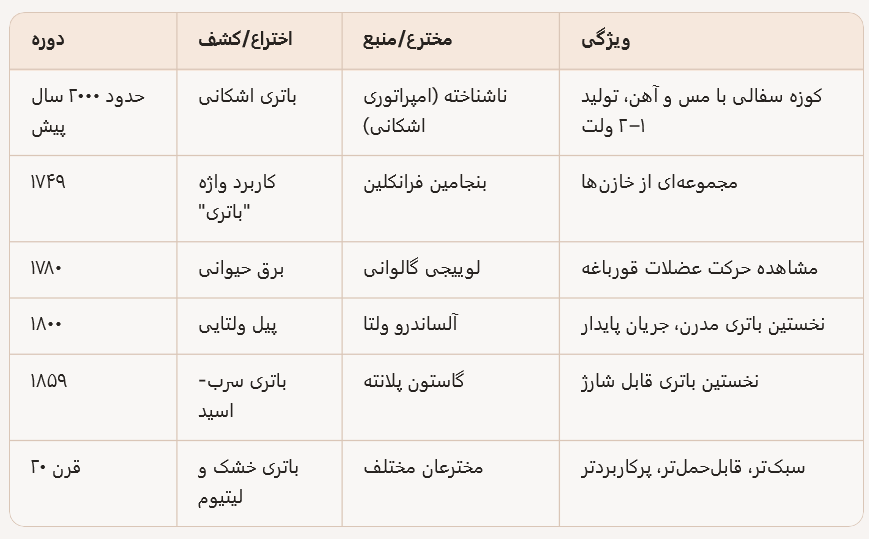 باتری از یک کوزه سفالی ساده در دوران اشکانی تا باتریهای لیتیوم-یون امروزی، مسیری طولانی طی کرده است. اختراع ولتا نقطه عطفی بود که امکان استفاده گسترده از برق را فراهم کرد و زمینهساز انقلاب صنعتی و فناوریهای مدرن شد.