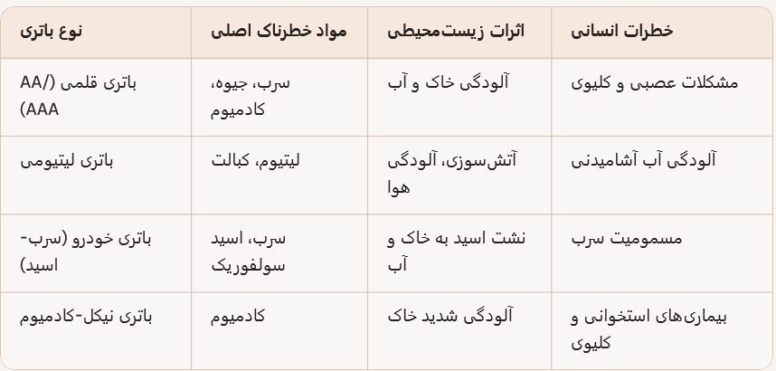 📊 جدول مقایسه اثرات انواع باتری بر طبیعت :